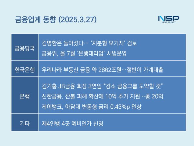 (서울=NSP통신) 강수인 기자 = 과거 조명을 못 받고 역사 속으로 사라졌던 ‘지분형 모기지’가 다시 떠올랐다. 김병환 금융위원장이 전날 ‘지분형 주택금융’을 검토하고 있다고 밝히면서다. 이를 두고 ‘이미 실패한 정책’이라는 의견과 함께 ‘김 위원장의 스탠스가 달라졌다’는 의견들이 나온다. 한편 지난해 우리나라의 부동산금융이 2682조원까지 늘어났다.