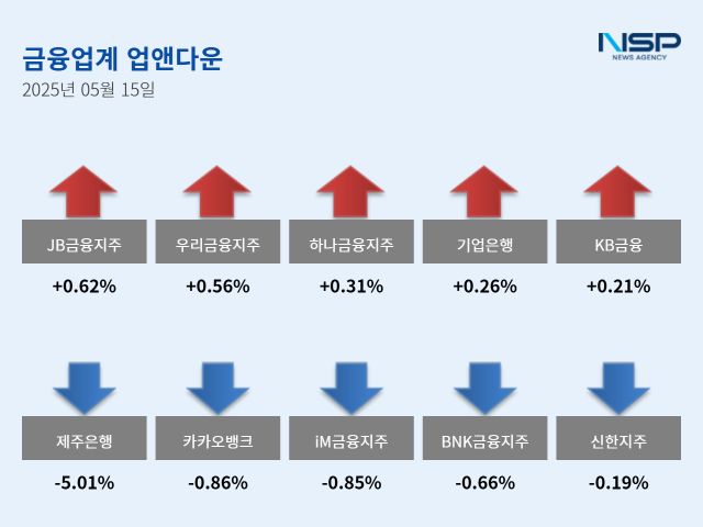 (서울=NSP통신) 강수인 기자 = 15일 코스피(-0.73%), 코스닥(-0.79%)은 모두 하락했다. 이 가운데 은행주는 전거래일 대비 0.05% 상승했다. 은행주는 11종목 가운데 5종목이 상승, 6종목이 하락했다.