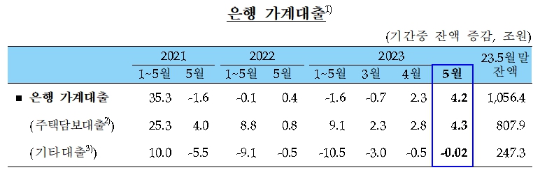 9일 한국은행이 발표한 ‘2023년 5월중 금융시장 동향’에 따르면 5월중 은행 가계대출은 주담대를 중심으로 증가규모가 전월 2조 3000억원에서 4조 2000억원으로 확대됐다.