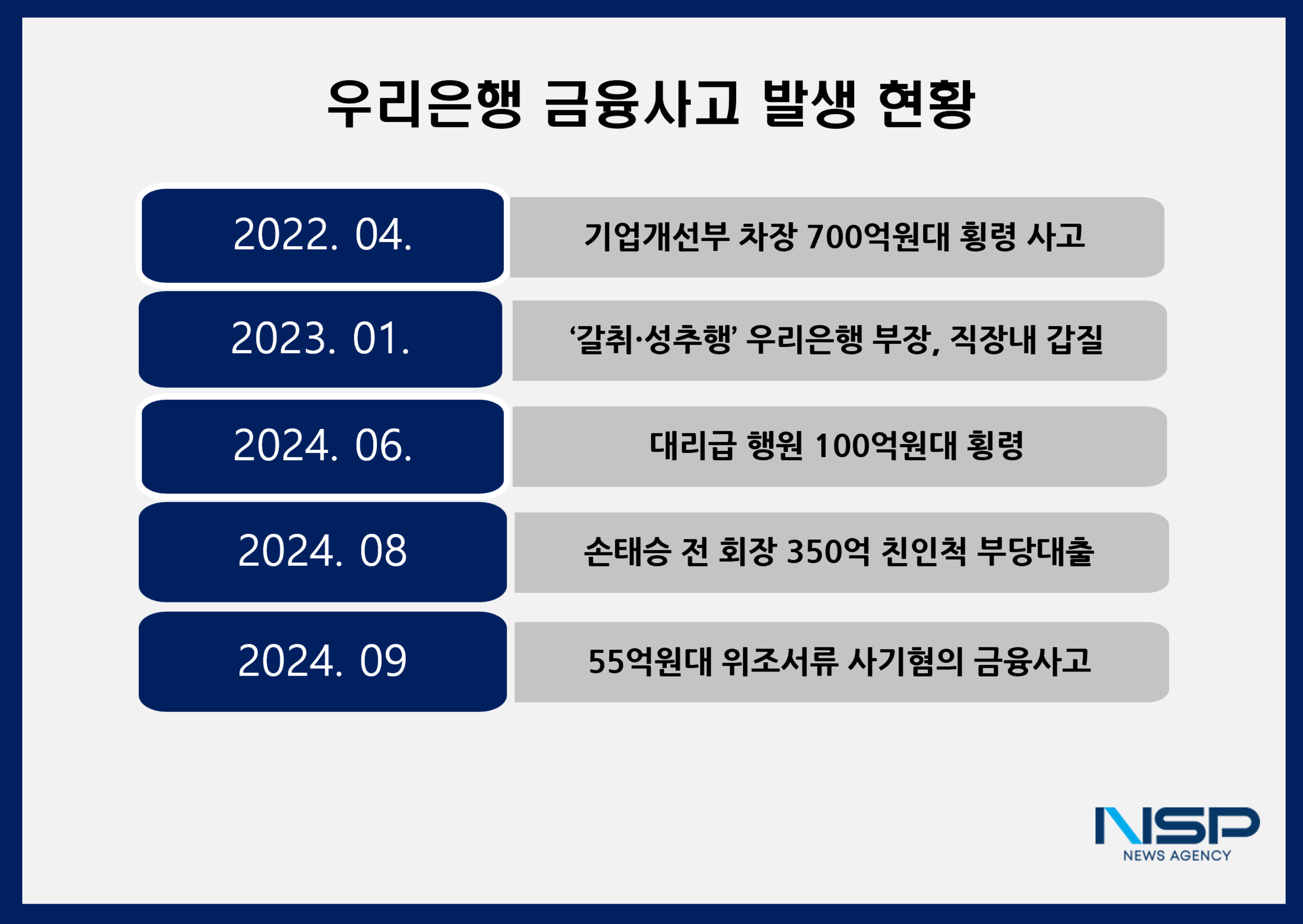 (서울=NSP통신) 강수인 기자 = 손태승 전 우리금융 회장 연계 부당대출로 시끄러웠던 우리금융에서 엎친 데 덮친 격으로 같은 시기에 약 55억원에 달하는 금융사고가 발생했다. 우리금융은 “작정하고 속이면 잡아낼 수가 없다”면서도 “강화된 내부통제로 이번 금융사고를 잡아낸 것”이라는 입장이다.