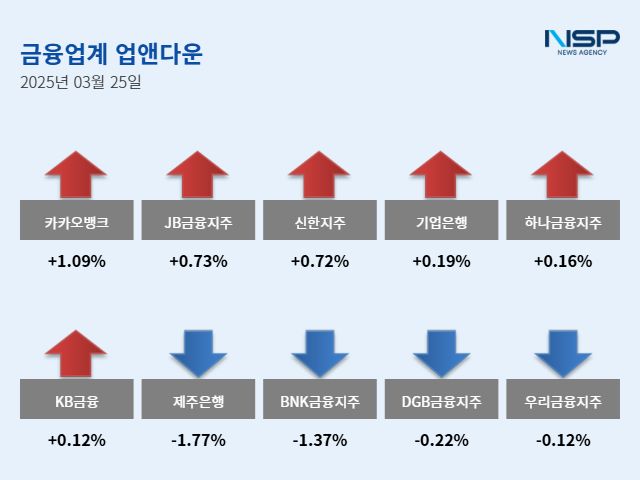 (서울=NSP통신) 강수인 기자 = 25일 코스피(-0.62%)와 코스닥(-1.24%)은 모두 하락했다. 이 가운데 은행주는 전거래일 대비 0.29% 상승했다. 은행주는 11종목 가운데 7종목이 상승, 4종목이 하락했다.