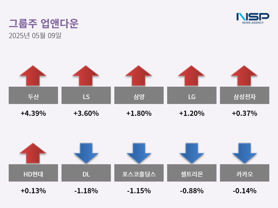 (서울=NSP통신) 최아랑 기자 = 9일 코스피(-0.09%), 코스닥(-0.97%)은 모두 하락했다. 이 가운데 10대 그룹주는 상반된 흐름을 보였다. 가장 큰 변동을 보였던 종목은 두산이다. 두산은 4.39%(14500원) 상승해 34만50000원으로 장을 마감했다.
