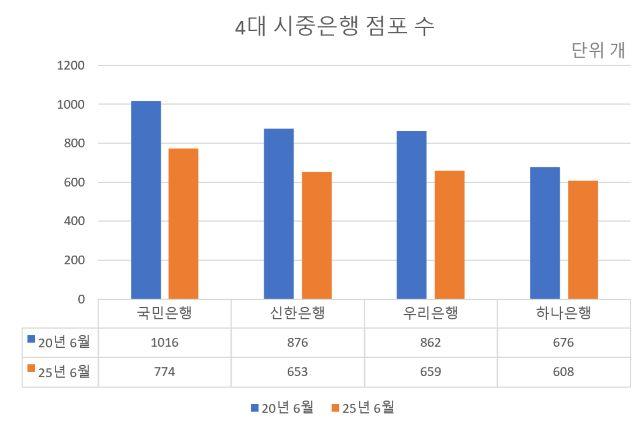금융감독원 전자공시시스템에 따르면 4대 시중은행(KB국민·신한·하나·우리)의 국내 점포(지점·출장소) 수는 지난 2020년 6월말 3430개에서 2025년 6월말 2694개로 약 21.5% 감소했다. 은행별로 살펴보면 ▲KB국민은행 1016개에서 774개로 23.8% 감소 ▲신한은행 876개에서 653개로 25.5% 감소 ▲우리은행 862개에서 659개로 23.5% 감소 ▲하나은행 676개에서 608개로 10% 감소했다.