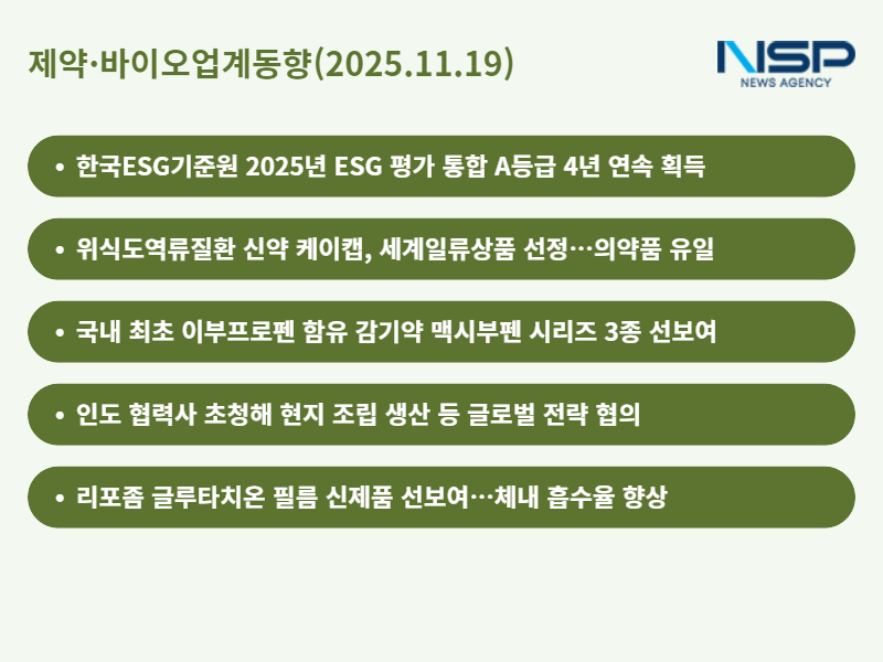 (서울=NSP통신) 정송이 기자 = 제약·바이오업계에서 ESG(환경·사회·지배구조) 경영 성과와 제품 경쟁력 인정이 잇따랐다. 신제품 출시와 글로벌시장 진출 협력도 이어졌다. 기업들은 지속가능경영 강화와 제품 다각화를 통해 국내외 시장에서 입지를 확대하고 있다.