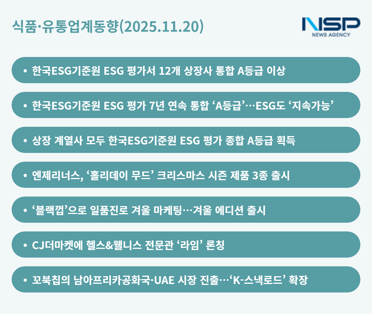 (서울=NSP통신) 옥한빈 기자 = 연말이 다가올수록 식품·유통업계는 이미지 재단장에 바쁘다. ESG 무대에서는 현대백화점그룹·빙그레·동원그룹이 나란히 ‘A급 성적표’를 과시했다. 소비 시장에서는 엔제리너스·하이트진로가 홀리데이 신제품을 연이어 선보이며 ‘미리 크리스마스’ 분위기를 주도했다. CJ제일제당은 건강 전문관 ‘라임’을 론칭하며 라이프스타일 공략에 나섰다. 한편 오리온 꼬북칩은 남아공·UAE 진출로 5대륙 진입을 완료하며 K스낵의 글로벌 외연을 다시 확장했다.