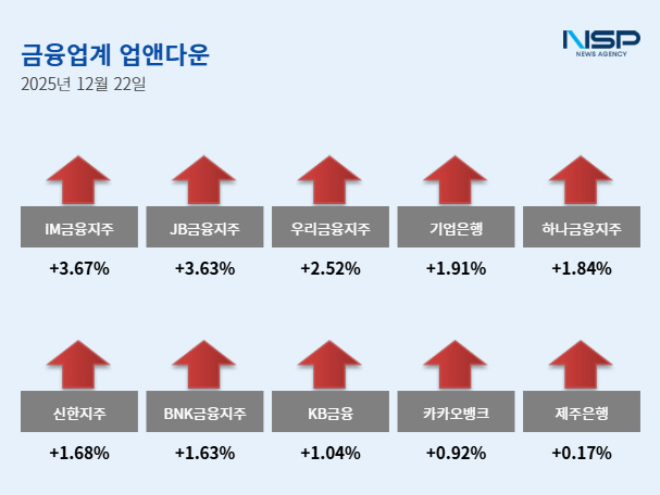 JB금융지주는 전거래일 대비 3.63%(900원) 올라 2만57700원으로 장을 마감했고 우리금융지주는 전거래일 대비 2.52%(700원) 상승해 2만8450원으로 장을 마쳤다.
