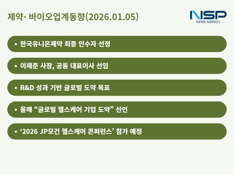 (서울=NSP통신) 정송이 기자 = 제약·바이오업계에서 기업 인수와 경영진 선임, 시무식 개최 소식이 잇따랐다. 기업들은 새해를 맞아 조직 개편과 중장기 비전 제시를 통해 사업 역량 강화에 나섰다. 부광약품은 한국유니온제약의 최종 인수자로 선정돼 생산능력을 확대하게 됐으며, 일동제약은 공동 대표 체제로 전환해 R&D 및 글로벌 분야 전문성을 강화했다. 동아쏘시오그룹과 대웅제약은 시무식을 통해 각각 R&D 기반 글로벌 도약과 헬스케어 생태계 주도 비전을 밝혔다. 삼성바이오로직스는 세계 최대 제약·바이오 투자 콘퍼런스인 JP모건 헬스케어 콘퍼런스에 참가해 글로벌 네트워킹을 강화할 예정이다.