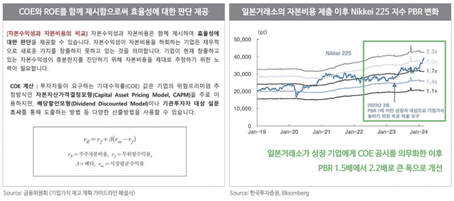 실제 일본에서는 2023년 3월 일본거래소가 상장기업을 대상으로 ‘자본비용 및 주가를 의식한 경영 실현을 위한 대응 방침’ 제출을 요구한 이후 COE 공시가 본격화됐다. 그 결과 2024년 1월 기준 니케이225지수의 주가순자산비율(PBR)은 1.5배에서 2.2배로 개선되며 기업가치 제고 효과가 나타났다는 평가다.