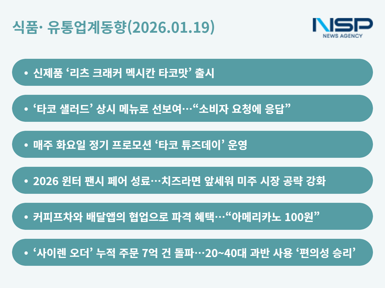 (서울=NSP통신) 옥한빈 기자 = 타코가 더 이상 외식 메뉴에만 머물지 않는다. 크래커부터 샐러드, 정기 프로모션까지 식품·외식업계 전반에 ‘타코 열풍’이 번지고 있다. 동서식품·써브웨이·타코벨은 각기 다른 방식으로 타코를 재해석하며 2030 입맛 공략에 나섰고, 오뚜기는 치즈라면을 앞세워 해외 시장에서 K-푸드 존재감을 키웠다. 한편 커피 시장에서는 ‘맛’보다 ‘방식’의 경쟁이 더 치열하다. 메가MGC커피와 배달의민족은 아메리카노 100원이라는 초강수로 픽업 시장 판을 흔들었다. 스타벅스는 사이렌오더 7억 건이라는 숫자로 디지털 주문의 표준을 굳혔다. 메뉴 혁신과 플랫폼 전략, 가격과 편의성 등 식품·유통업계는 무엇을 팔 것인가 보다 ‘어떻게 경험시킬 것인가’를 두고 경쟁하는 구도를 그려낸다.