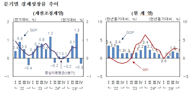 22일 한국은행이 발표한 ‘2025년 4분기 및 연간 실질 국내총생산(속보)’에 따르면 지난해 4분기 실질 국내총생산(GDP)은 전기 대비 0.3% 감소했다. 2025년 연간으로는 전년 대비 1.0% 성장했다.