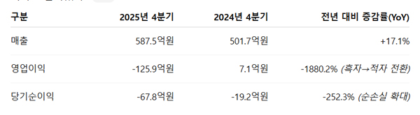 데브시스터즈(194480)는 2025년 4분기 연결 매출 587억으로 전년 동기 대비 17.1% 늘었다. 전분기 대비로도 매출이 7.1% 증가했다. 영업이익은 전년 동기 흑자에서 적자로 돌아서 영업손실 126억을 기록했고, 당기순이익도 적자가 지속돼 순손실 68억을 기록했다.