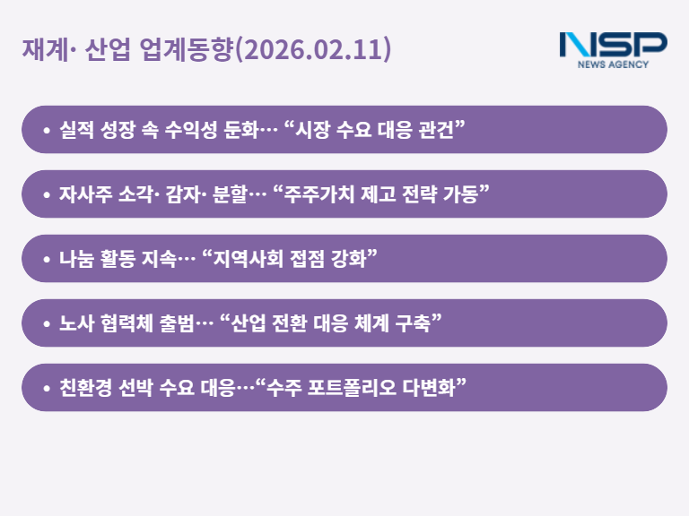 (서울=NSP통신) 최아랑 기자 = 국내 주요 기업들이 실적 관리와 주주환원 정책을 병행하는 한편 수주 확대·노사 협력·사회공헌 활동 등 다양한 방식으로 경영 안정성과 중장기 성장 기반 확보에 나서는 흐름이다.