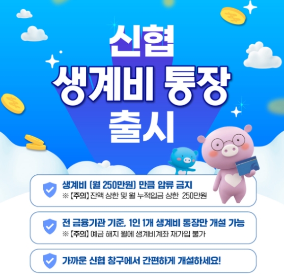 ‘신협 생계비통장’은 개인 고객이면 누구나 가입할 수 있으며 가까운 신협 영업점을 방문해 신청하면 된다.
