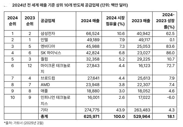 SK Hynix продемонстрировала самые высокие темпы роста среди 10 крупнейших компаний с годовым ростом выручки в 86% в 2024 году, заняв четвертое место с выручкой в 42,8 млрд долларов. Это объясняется ростом средней цены продажи памяти и лидирующим положением в области высокопропускной памяти(HBM) способностью для приложений ИИ.
