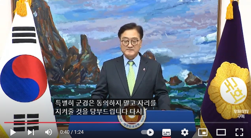 (서울=NSP통신) 김승철 기자 = 4일 새벽 우원식 국회의장이 윤석열 대통령의 비상계엄 선포에 대해 자신의 유튜브 채널 생중계 방송을 통해 “국회는 헌법적 절차에 따라 대응조치하겠다”며"국회의원들께서는 국회 본회의장으로 모여 주시기 바랍니다"고 말했다.